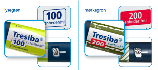 Tresiba® adskiller sig fra andre insulinprodukter ved at findes i to styrker: I henholdsvis 100 IE/ml og 200 IE/ml. Dosis i antal enheder skal ikke omregnes, hvis der sker et skift fra én styrke til en anden. Den intelligente dosistæller er designet, så antallet enheder, der vises i dosistællerens vindue, er den reelle dosis i enheder – uanset styrken af Tresiba® FlexTouch®.